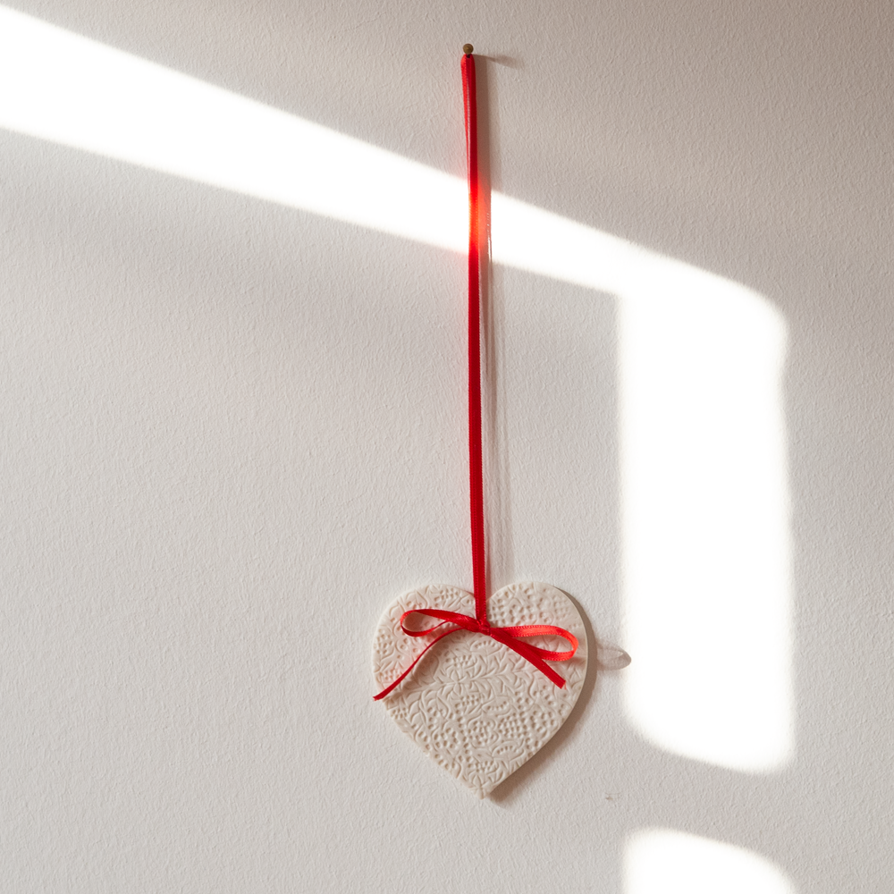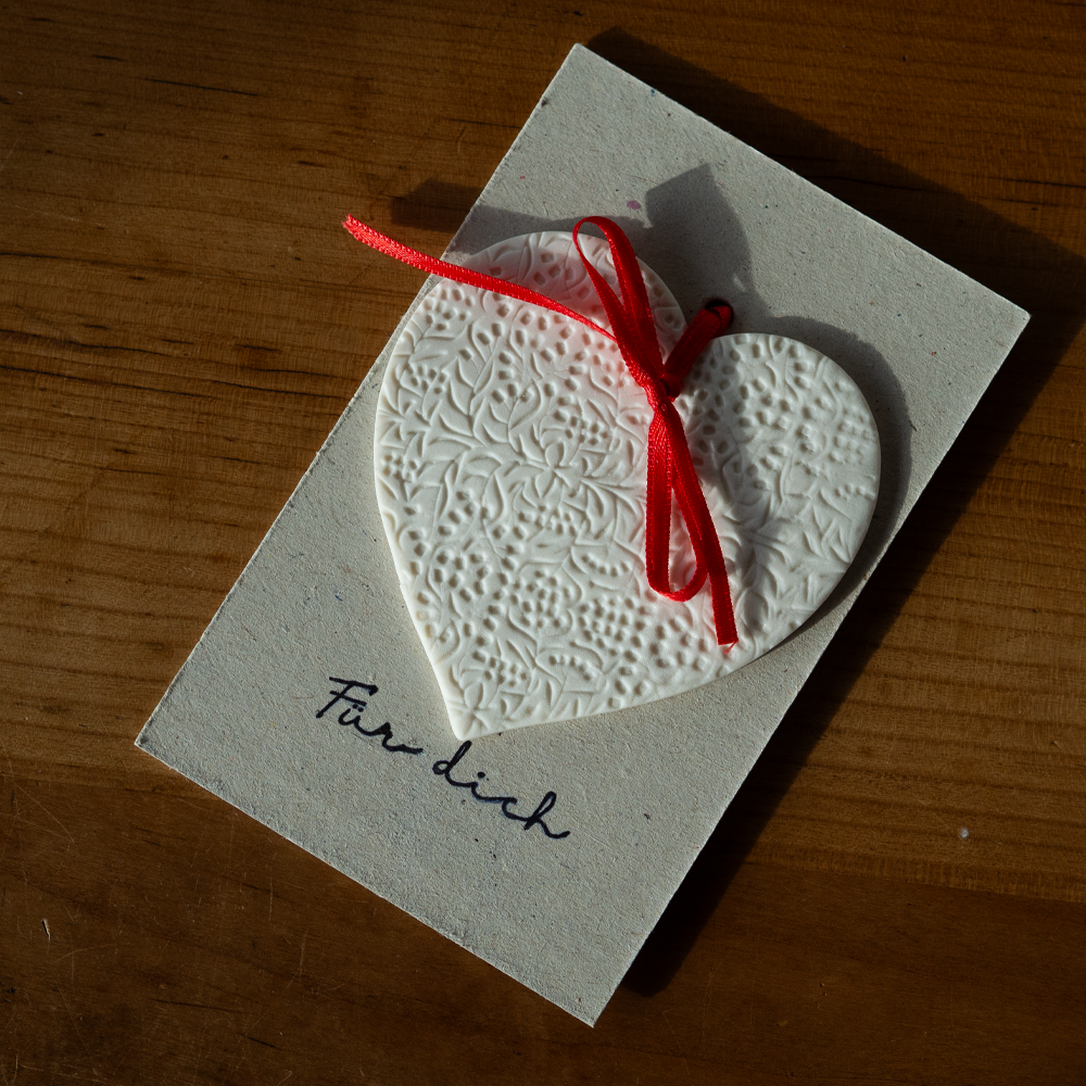 Ein kleines Geschenk mit großer Wirkung: Dieser liebevoll gefertigte herzförmige Anhänger aus hochwertigem weißen Porzellan ist ein besonderes Detail für Ihre/Ihren Liebsten. Die fein eingeprägte Struktur auf der Oberfläche verleiht dem Herz ein edles, handgemachtes Erscheinungsbild – zart, stilvoll und einzigartig.
